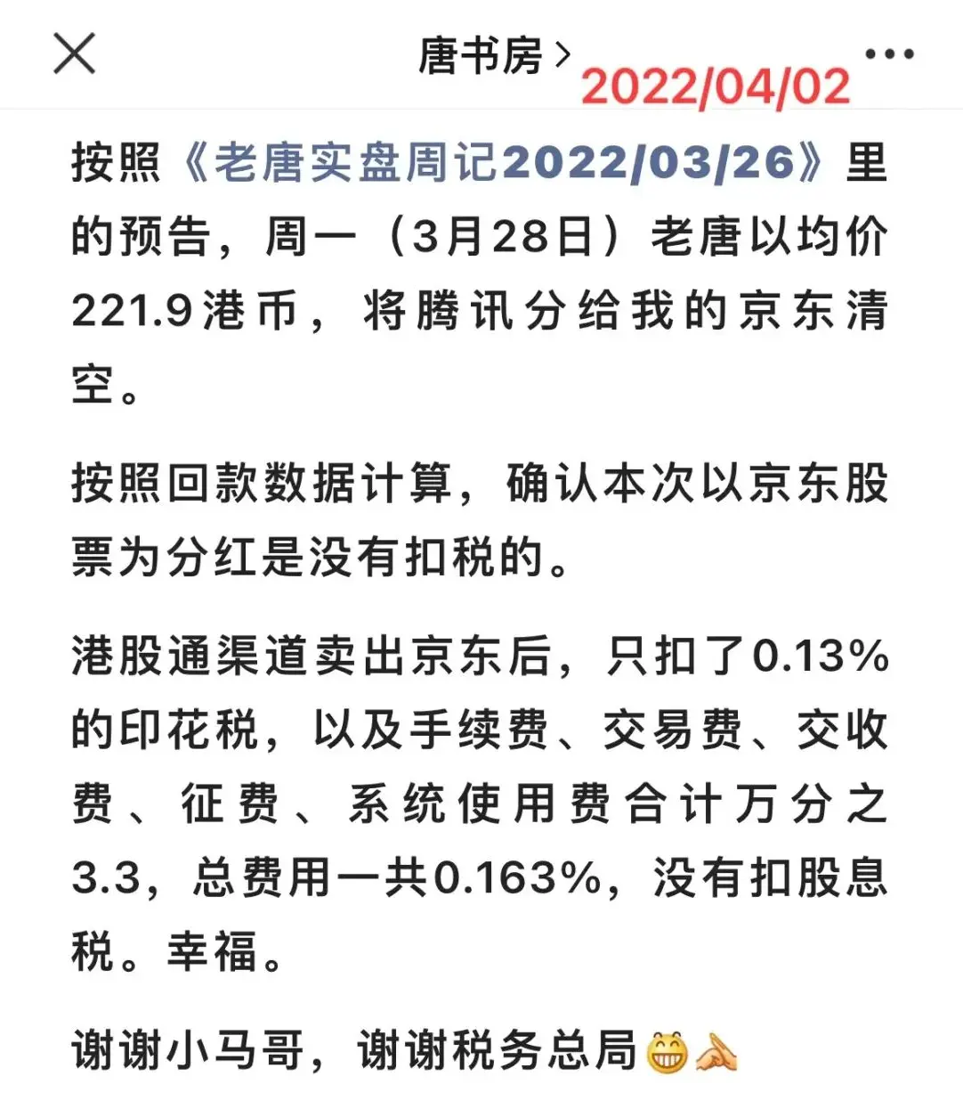 根据上次分京东的经验,港股通渠道和港股账户没区别,分股票和卖出股票时都不扣股息税。