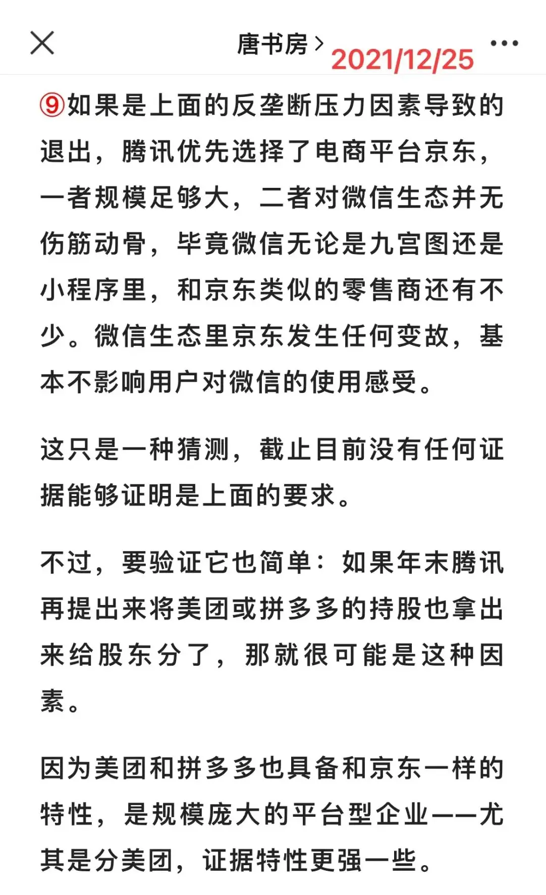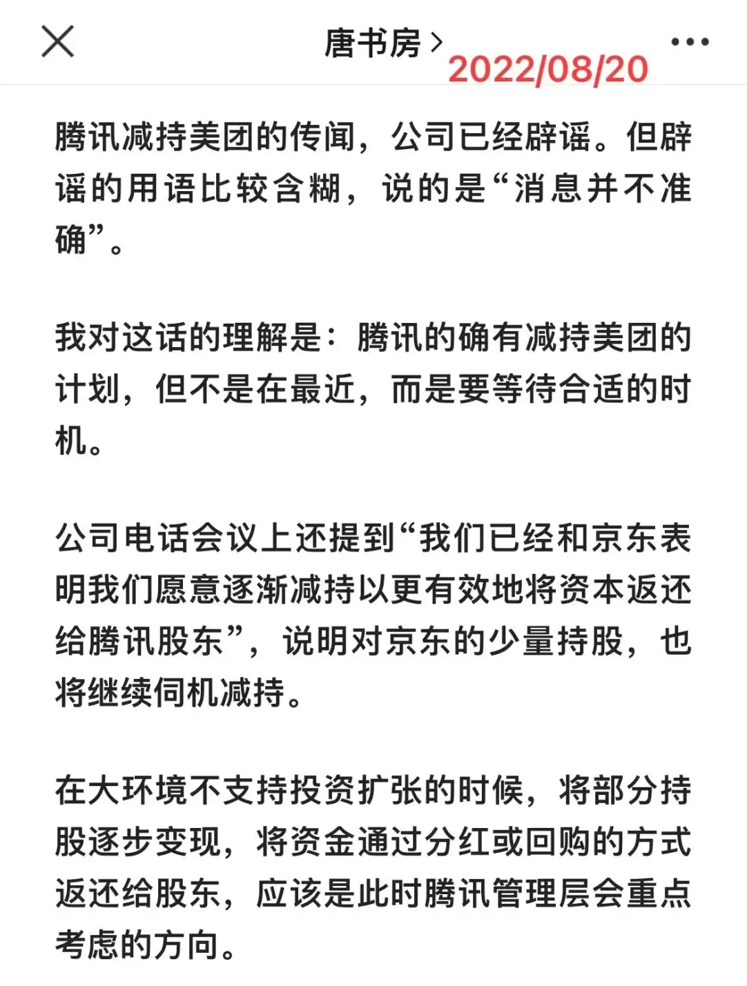 此时我的看法没有变化,个人认为回馈股东是台面上的理由,也确实是合理的,但分京东和分美团的行为,主要还是因为反垄断的压力。