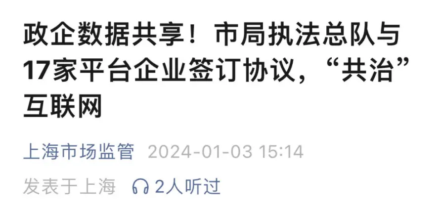 上海市监局执法总队,与17家互联网平台企业签订《协作共治备忘录》,加强沟通反馈,提高互联网治理水平。