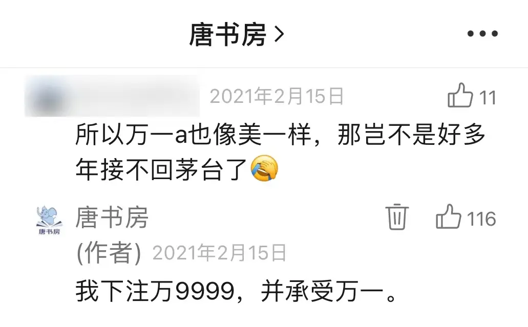 三年前,市场像这位朋友一样,担心A股像美股一样,一去不回头,导致我多年接不回茅台,我不信;今天,市场担心中国变成West Korea,股市归零,我还是不信。