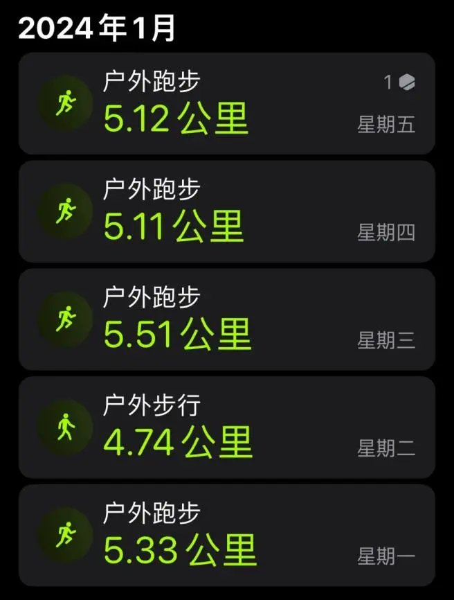 本周跑步四次,散步一次,单次距离均为五公里左右。