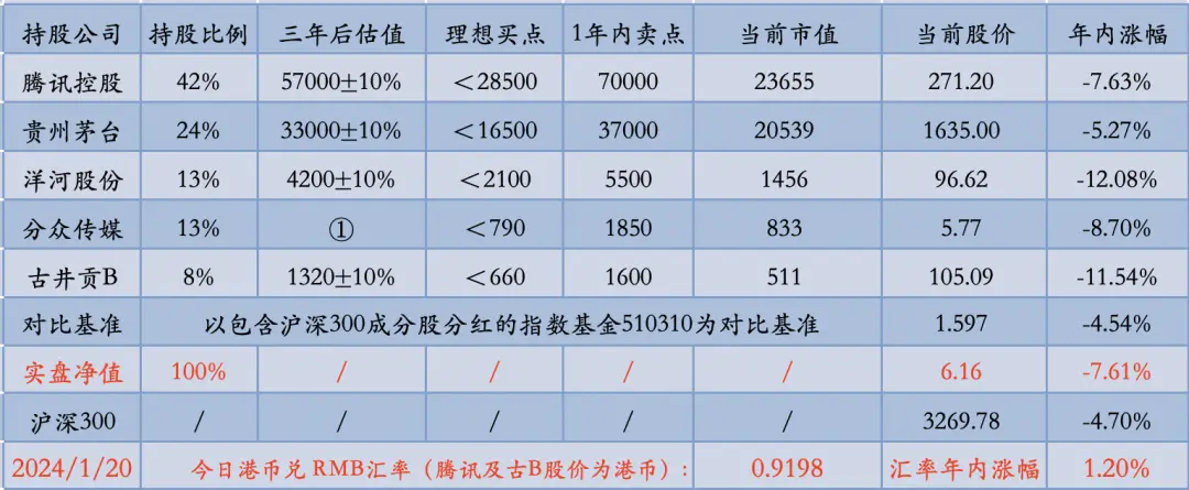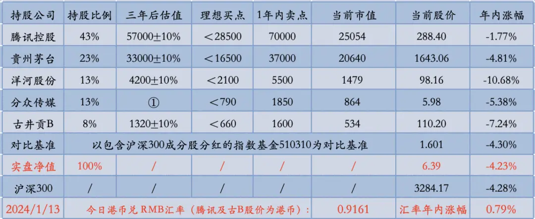 腾讯控股42%,贵州茅台24%,洋河股份13%,分众传媒13%,古井贡B8%。
