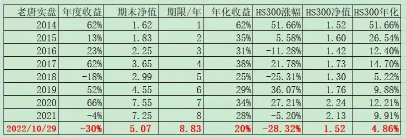 注:老唐实盘年度收益率,取「基金净值法收益率」和「资金加权收益率」二者之间的低值记录,均不含新股收益。