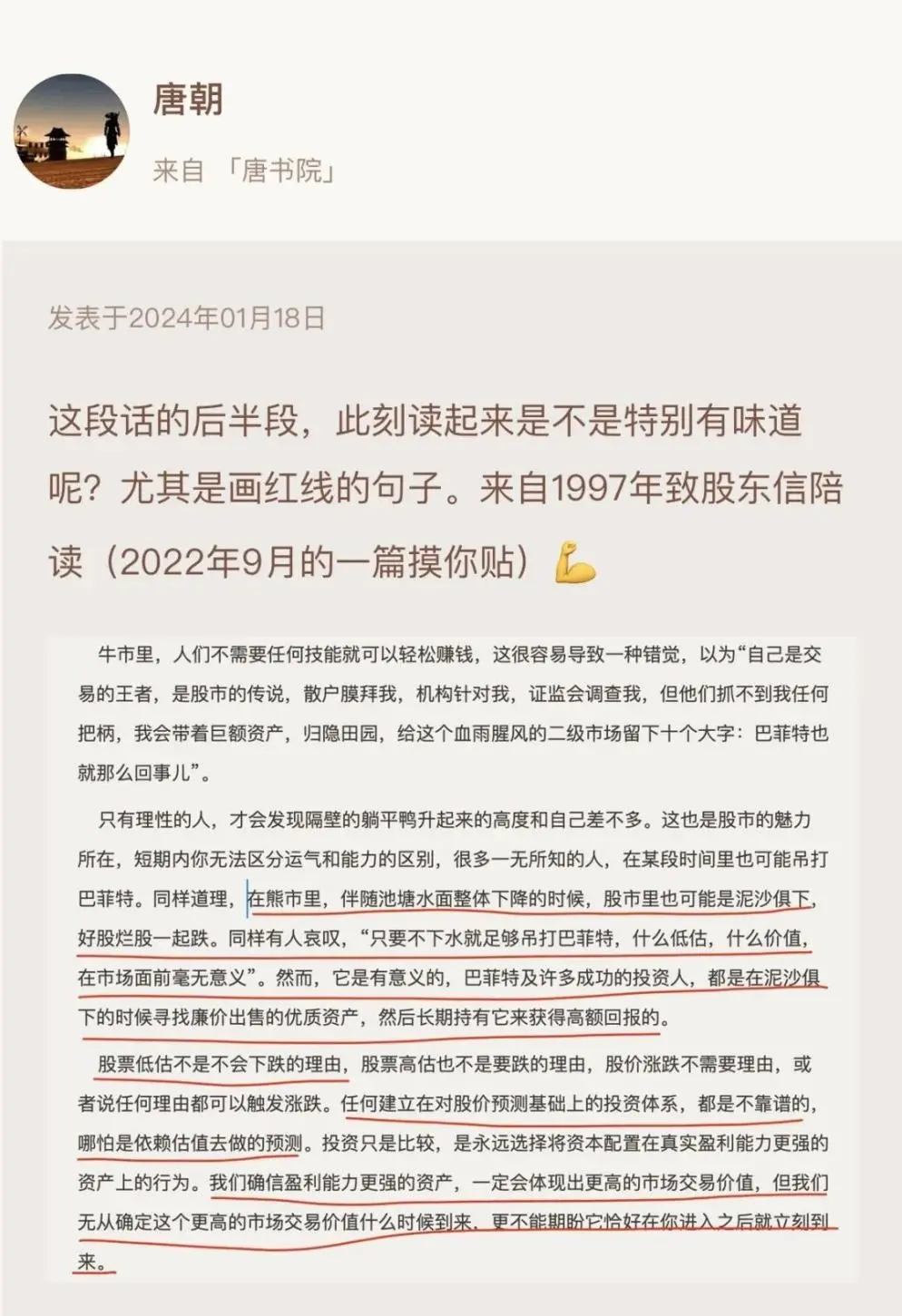 没有。相反,他白纸黑字地写下:“(我相信)随着时间的推移,股价最终必然会与企业经营表现大致相当的”,同时对股市作出了自己的预言: