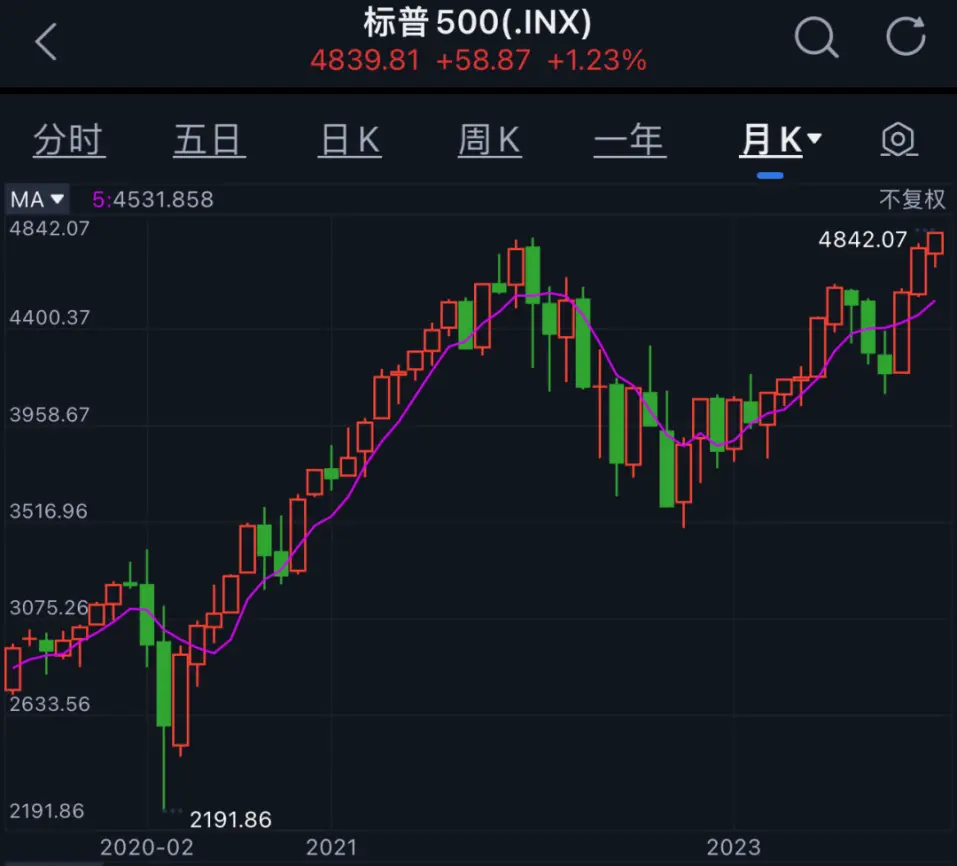我们之所以觉着我们更惨,只不过是我们最近三五年不景气,而美帝股市最近三五年特别景气:2019年末到2023年末的四年,美国SP500指数基金含息涨了74%(昨晚又创历史新高了)