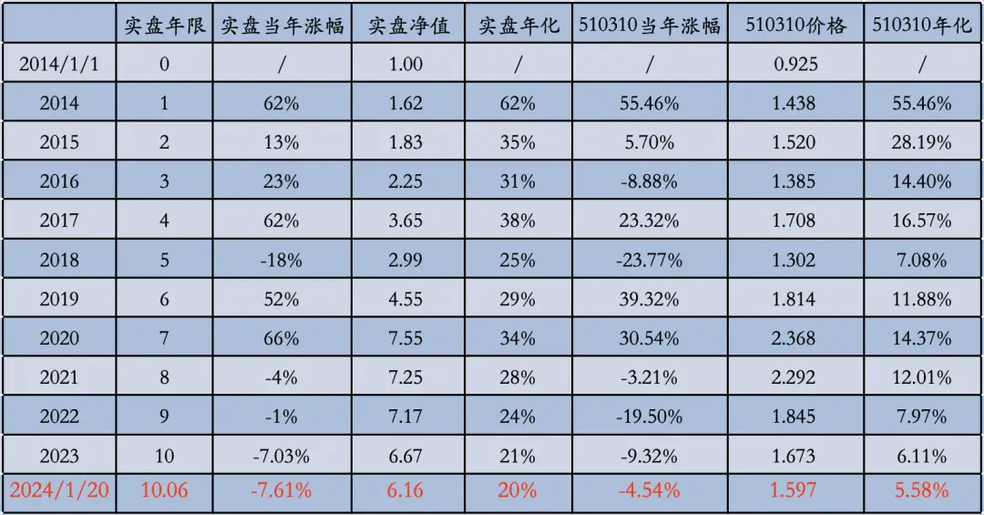 510310此刻是1.597元,十年前的今天(2014年1月20日)是0.862元,十年涨了85%出头。