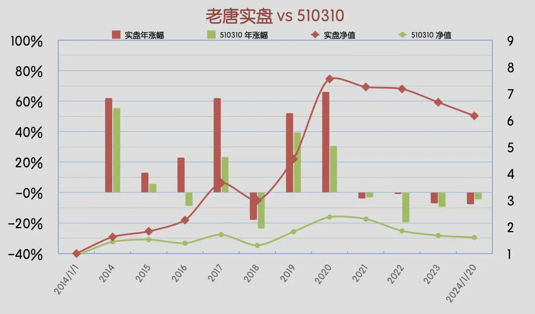 2024年内,沪深300指数基金510310涨幅-4.54%,老唐实盘净值涨幅-7.61%。