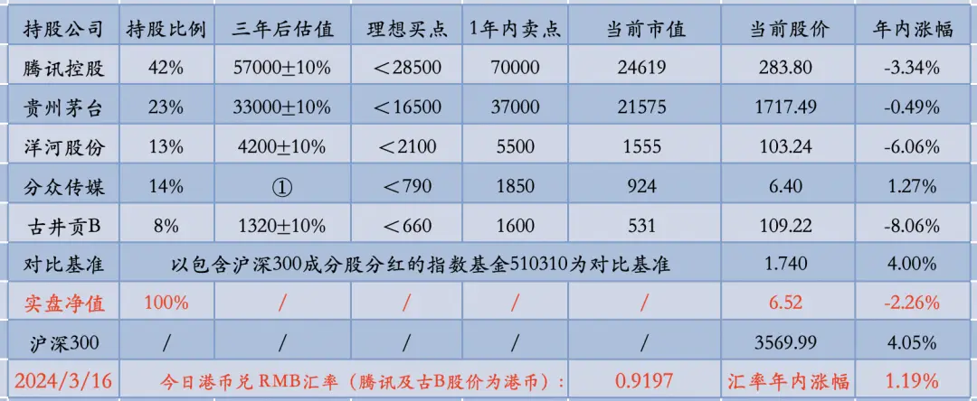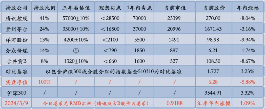 腾讯控股42%,贵州茅台23%,洋河股份13%,分众传媒14%,古井贡B8%。