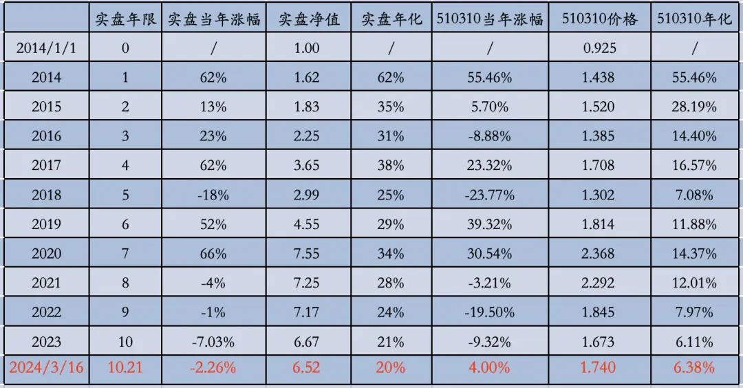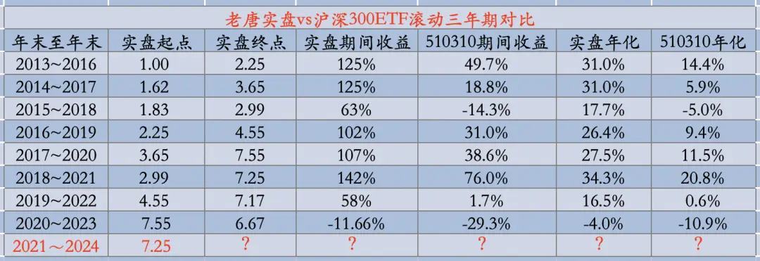 注:老唐实盘年度收益率,取「基金净值法收益率」和「资金加权收益率」二者之间的低值记录,均不含新股收益。