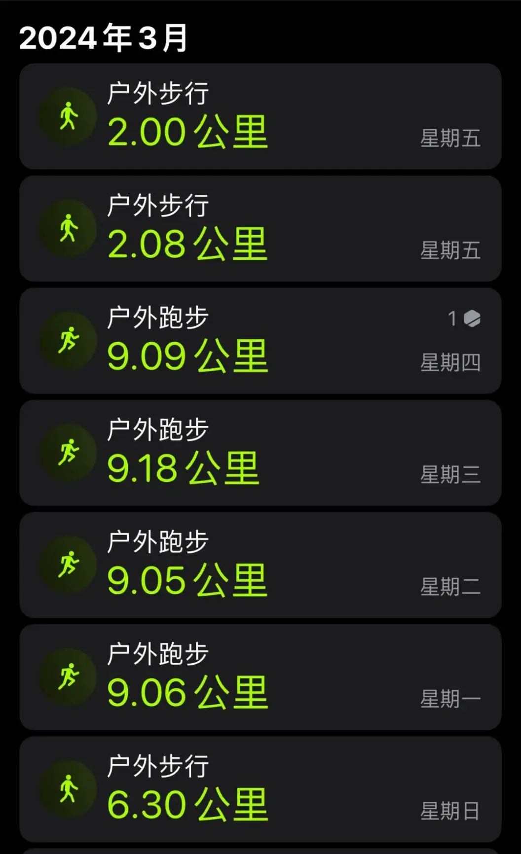 本周跑步4次,合计约36公里,散步2次,合计约10公里。