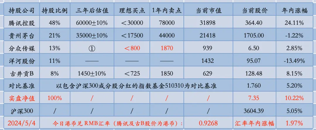腾讯控股48%,贵州茅台21%,分众传媒13%,洋河股份11%,古井贡B8%。