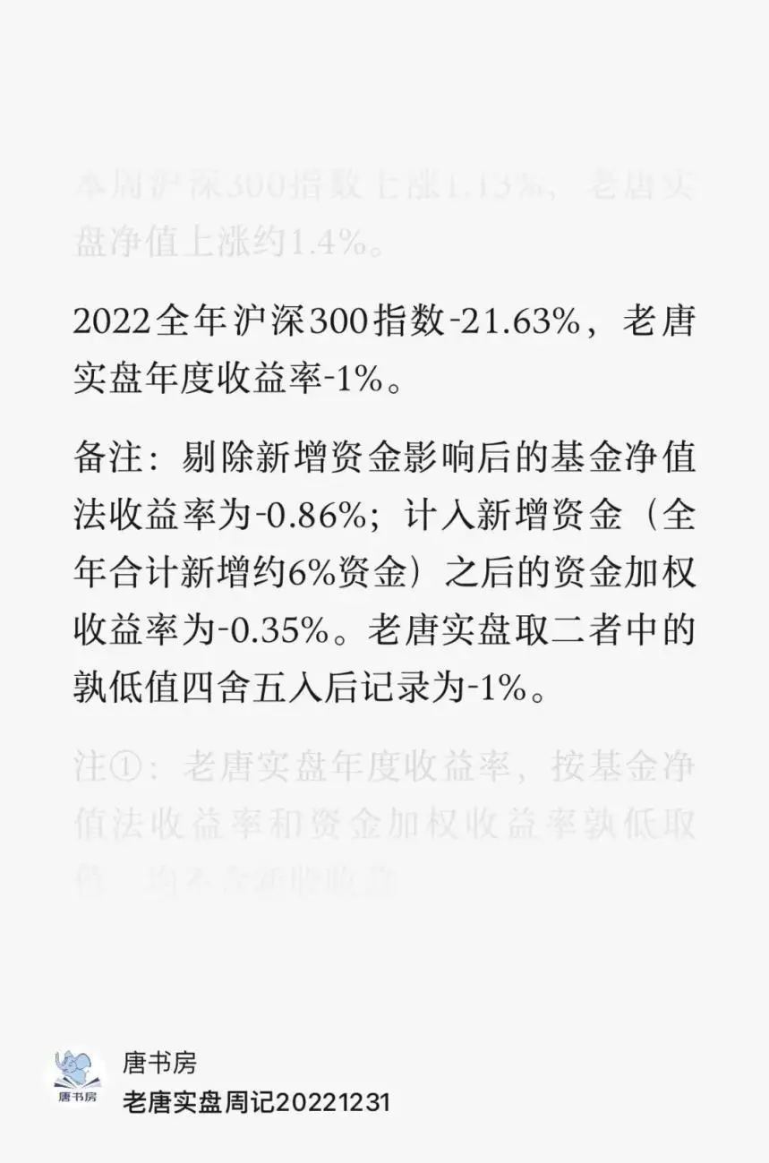 注:老唐实盘年度收益率,取「基金净值法收益率」和「资金加权收益率」二者之间的低值记录,均不含新股收益。