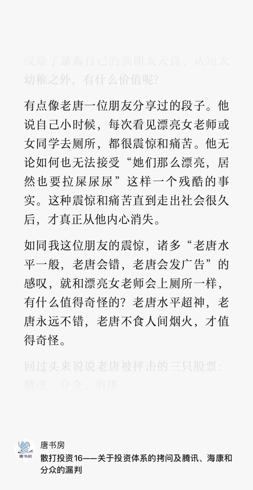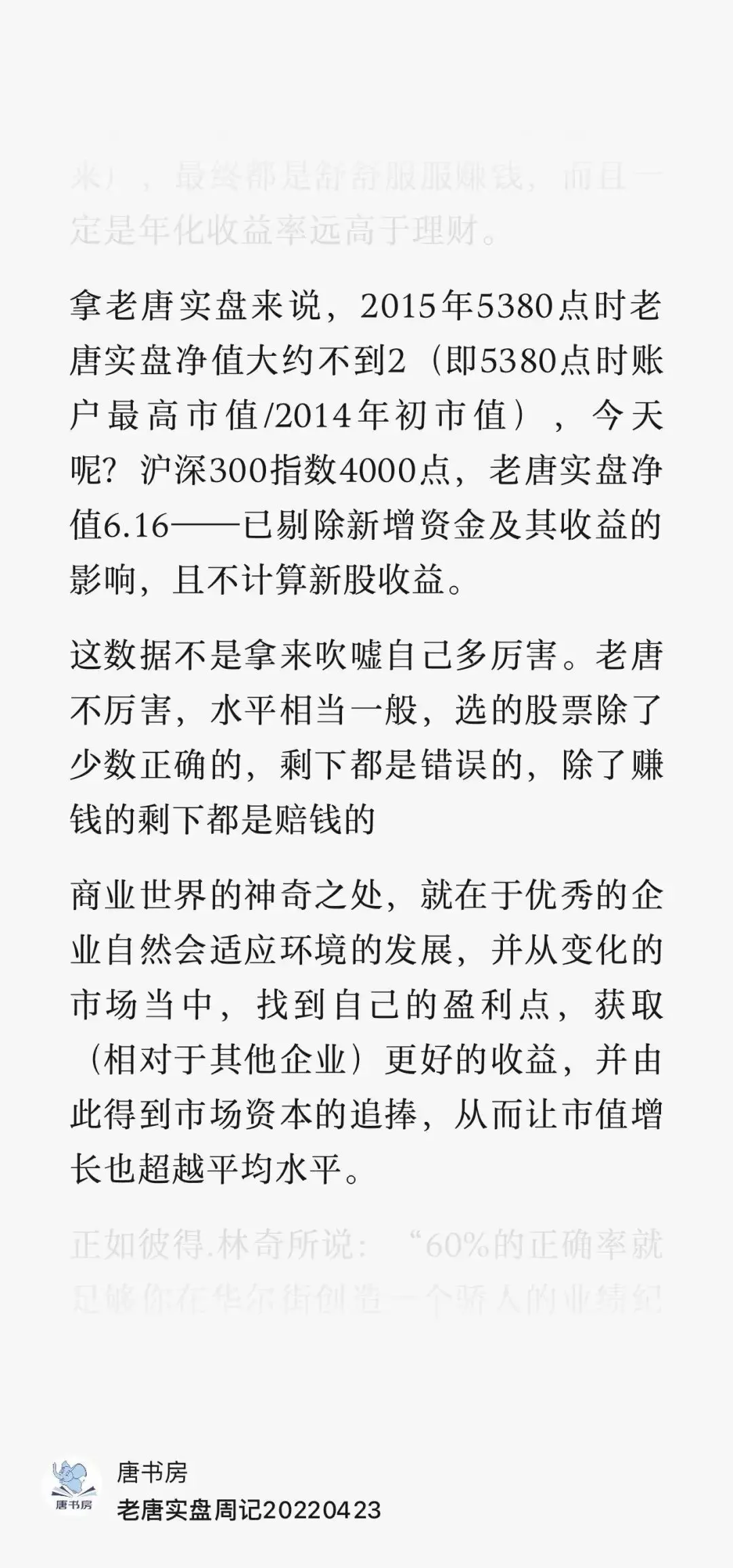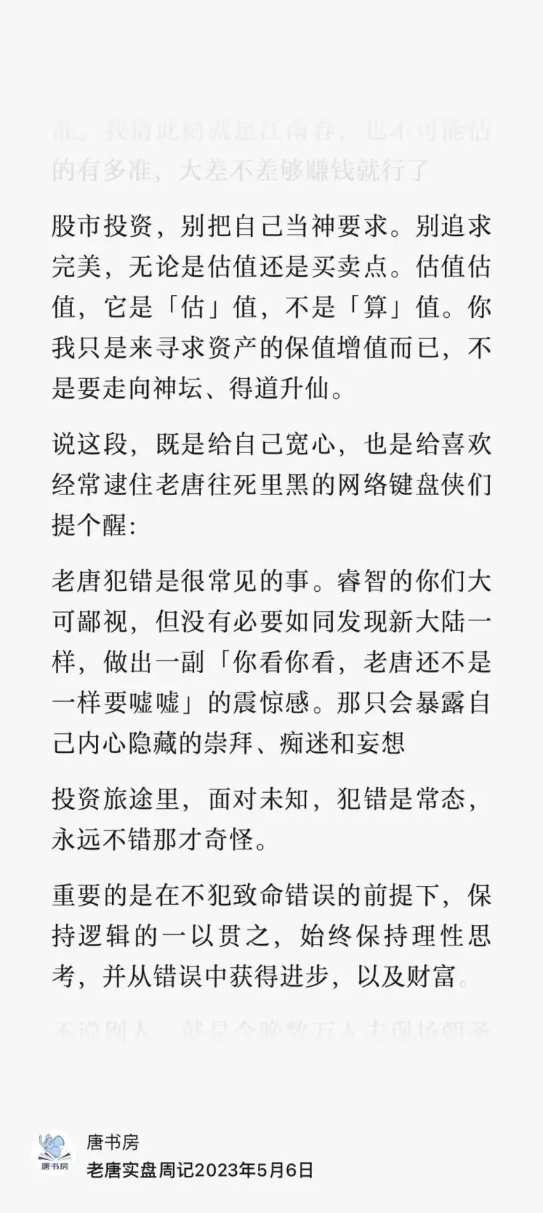 还有部分朋友,据说震惊于老唐深入研究那么久,那么多,那么有信心,照样承认了错误,由此得出结论说投资太难了,灰心了!
