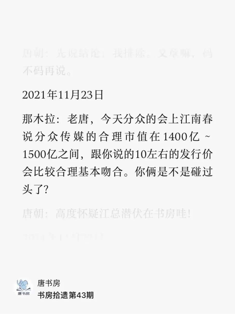 早在2021年11月5日的文章里,我写过香港上市要10元以上的发行价才划算,后来江总自己也说了他对分众的合理估值是1400~1500亿市值。