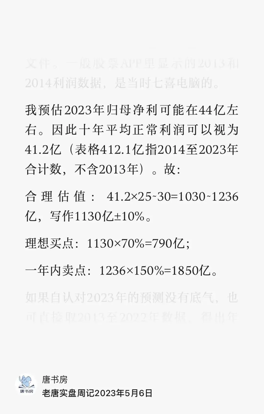 之前对2023年预估的是44亿,十年平均利润为41.2亿,买点<790亿,卖点>1850亿。