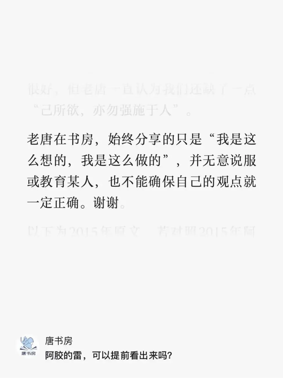 我一贯同意“老唐水平稀松平常”的说法,始终强调我分享的只是“我是这么想的,我是这么做的”,并无意说服或者教育某人,也不能确保自己的观点是对的。