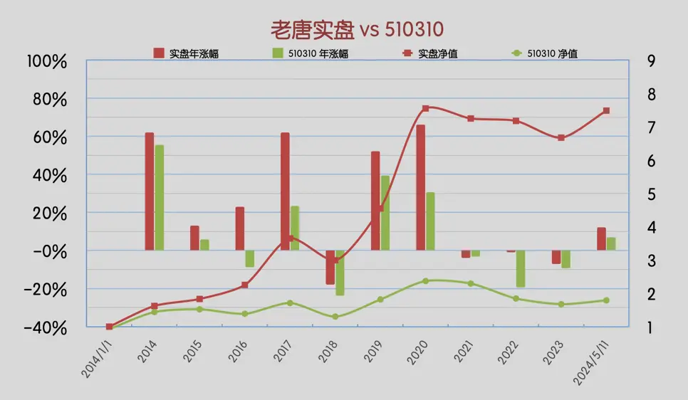 本周沪深300指数基金510310上涨1.65%,老唐实盘净值上涨1.76%。