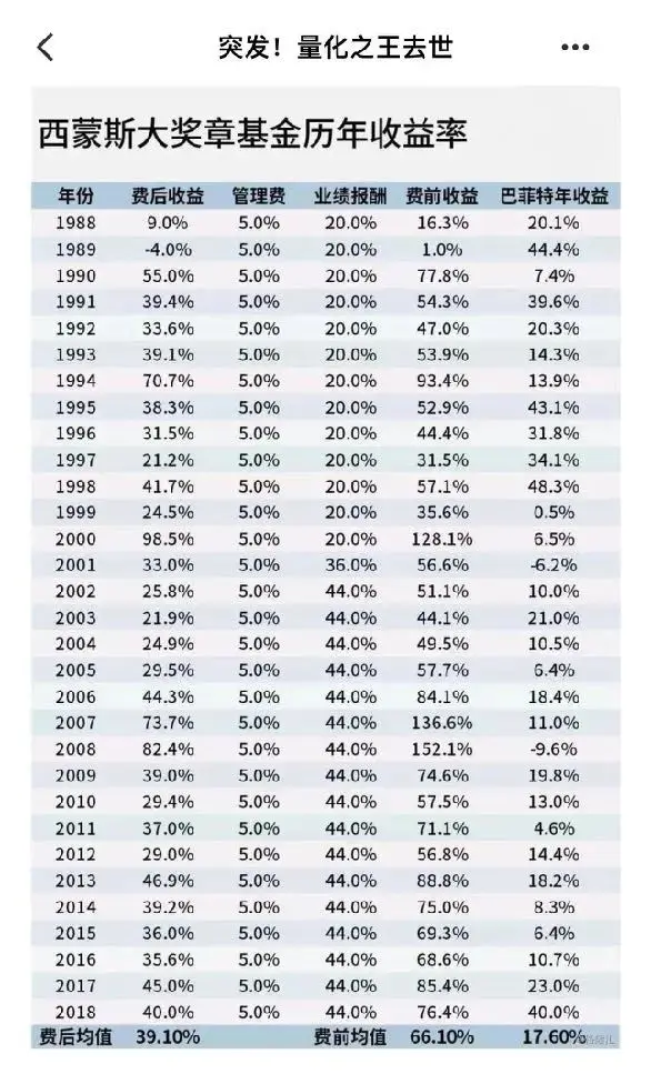 今天媒体发的大奖章基金历史收益率数据,如下表