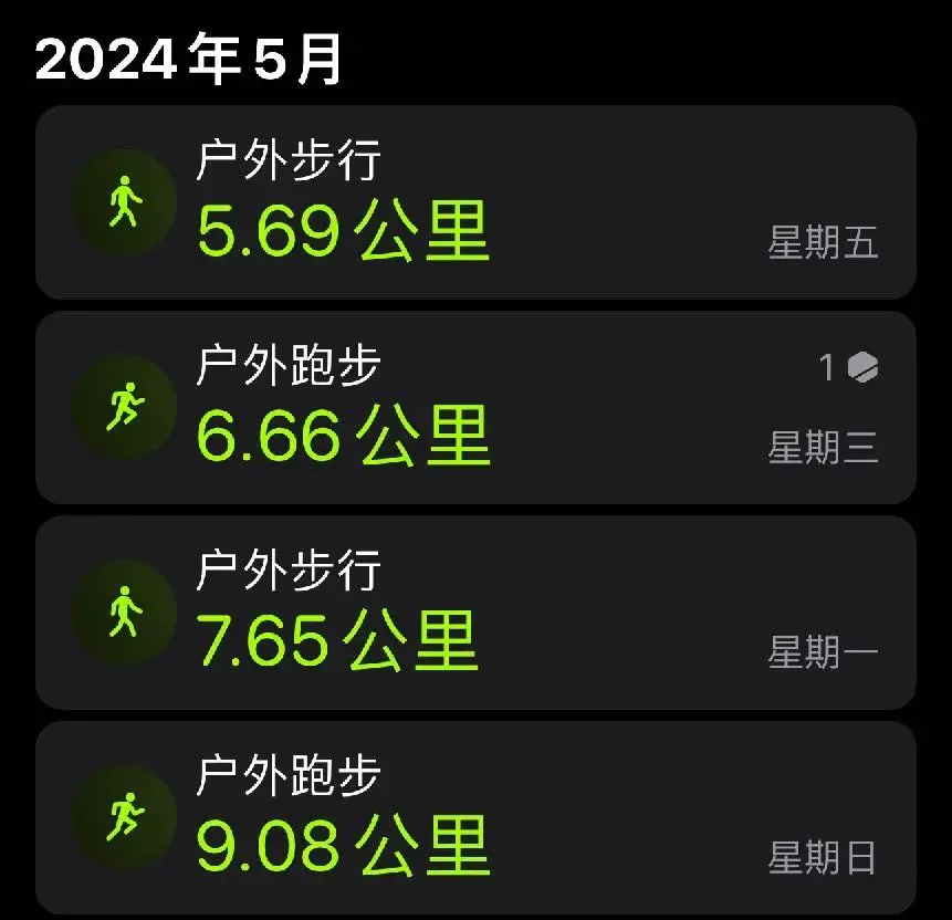 本周跑步两次合计约15公里,散步两次合计约13公里。