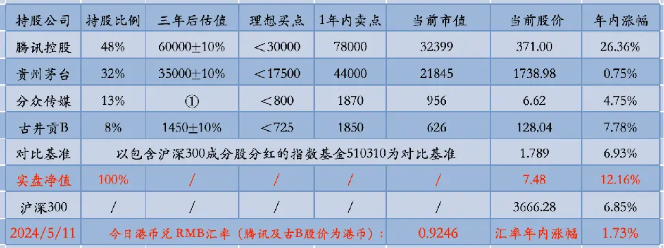 腾讯控股48%,贵州茅台32%,分众传媒13%,古井贡B8%。