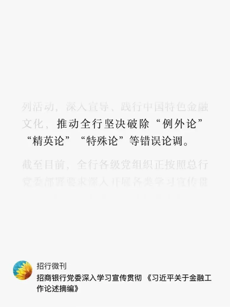 在这篇文章中,招行党委提出【将深入宣导、践行中国特色金融文化,推动全行坚决破除“例外论”“精英论”“特殊论”“股份制银行有别论”等错误论调。】