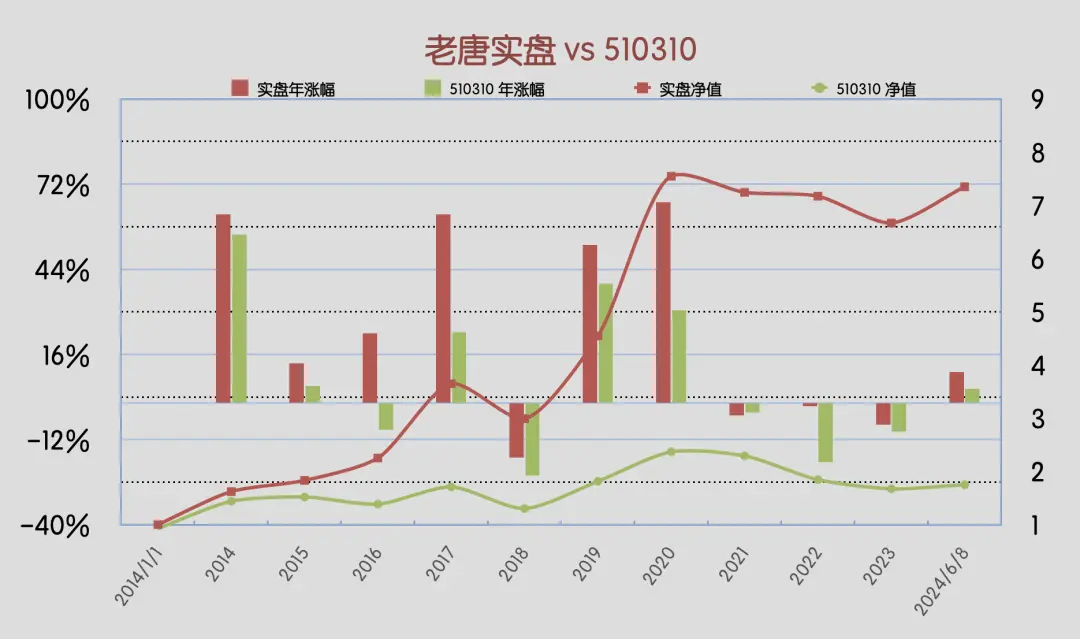 2024年内,沪深300指数基金510310涨幅4.60%,老唐实盘净值涨幅10.20%。