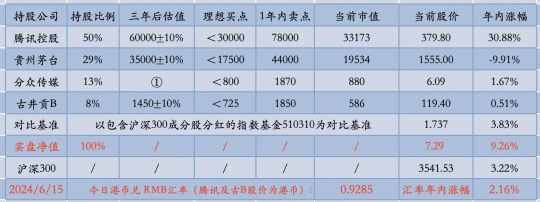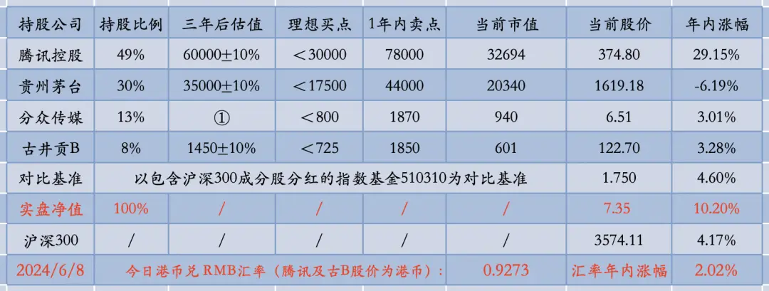 腾讯控股50%,贵州茅台29%,分众传媒13%,古井贡B8%。