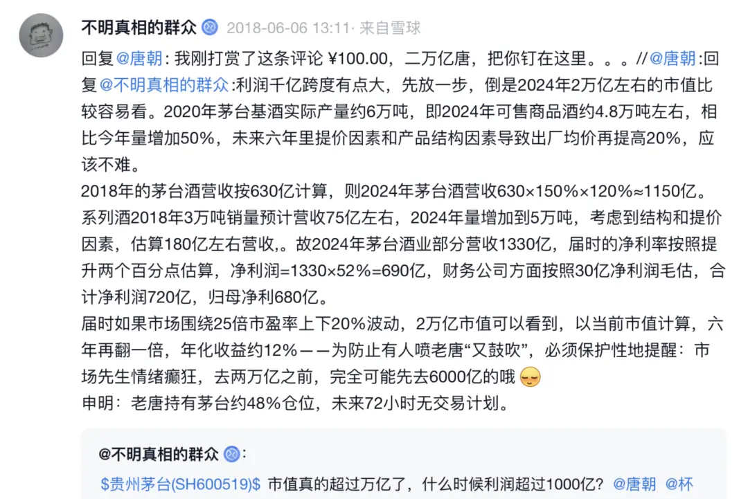 六年前,展望2024年两万亿市值,觉着不可思议,太乐观了。此刻茅台就是两万亿啊,就是六年前最乐观的预期,怎么就失望了呢?