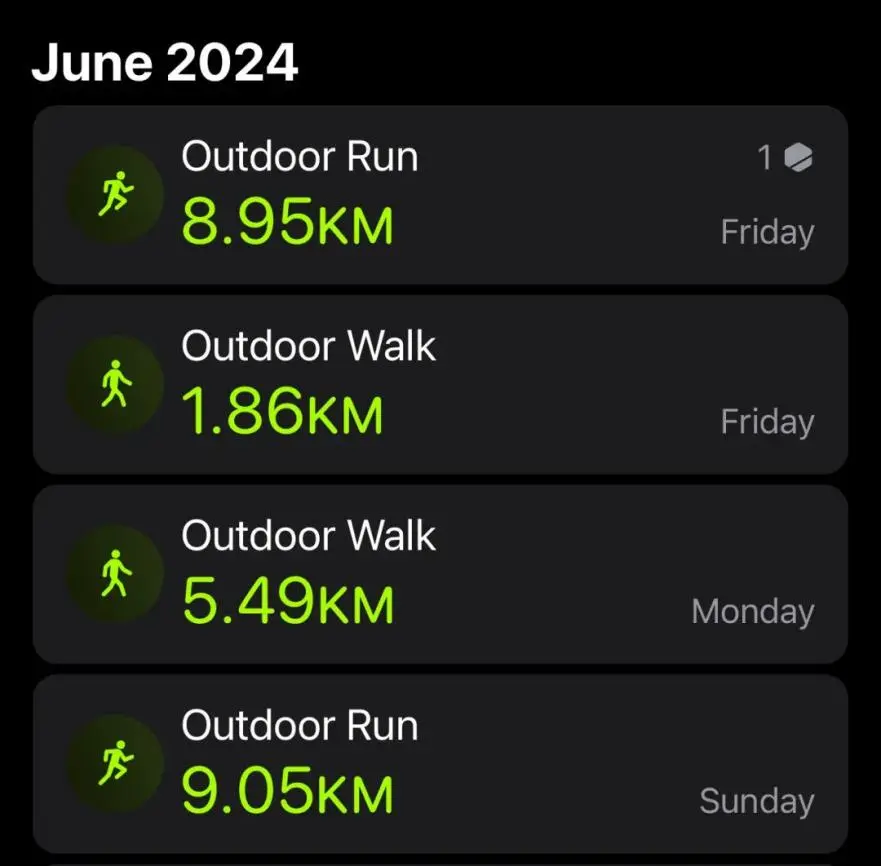 本周跑步两次合计18公里,散步两次合计约7公里。
