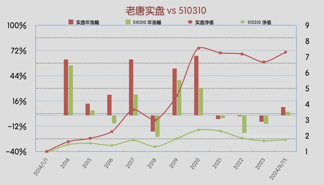 本周沪深300指数基金510310下跌0.74%,老唐实盘净值下跌0.86%。