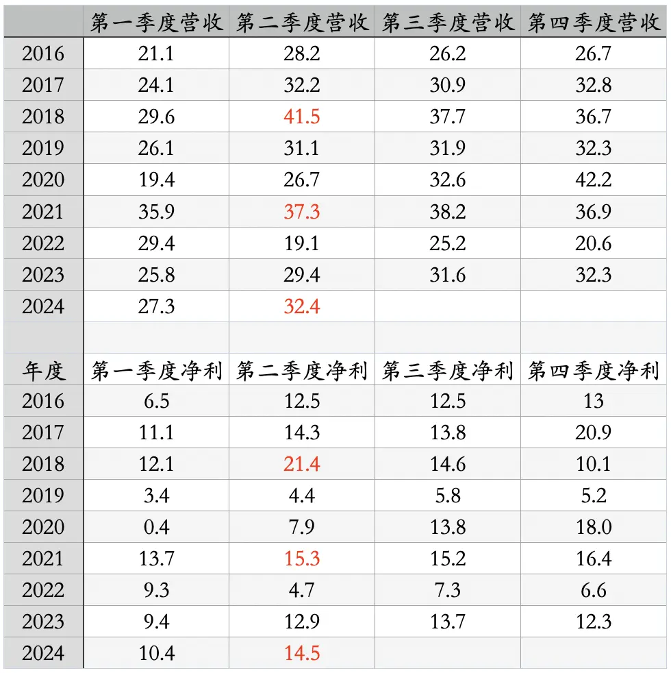比如,此刻无论我们以下半年同比0增长去模拟,也就是直接用2023年下半年数据+2024年上半年数据,能得出全年27.3+32.4+31.6+32.3=123.6亿营收,10.4+14.5+13.7+12.3=50.9亿归母净利的模拟结果;
