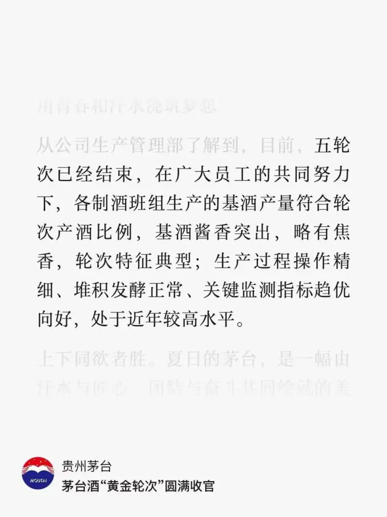 公司7月26日官微上发布(该文披露,2024年7月26日,五轮次基酒生产结束)过对五轮次的总结: