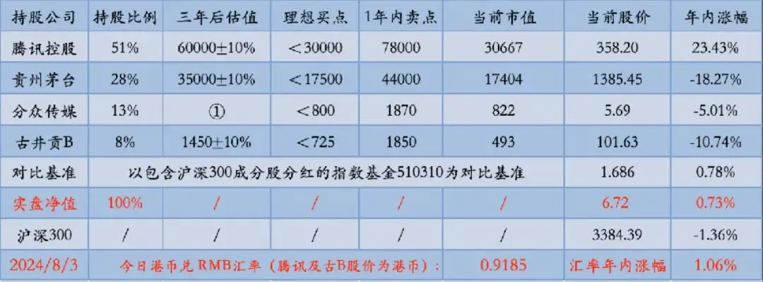 腾讯控股51%,贵州茅台29%,分众传媒13%,古井贡B8%。下表除股价和百分比之外,其他科目单位均为人民币亿元。