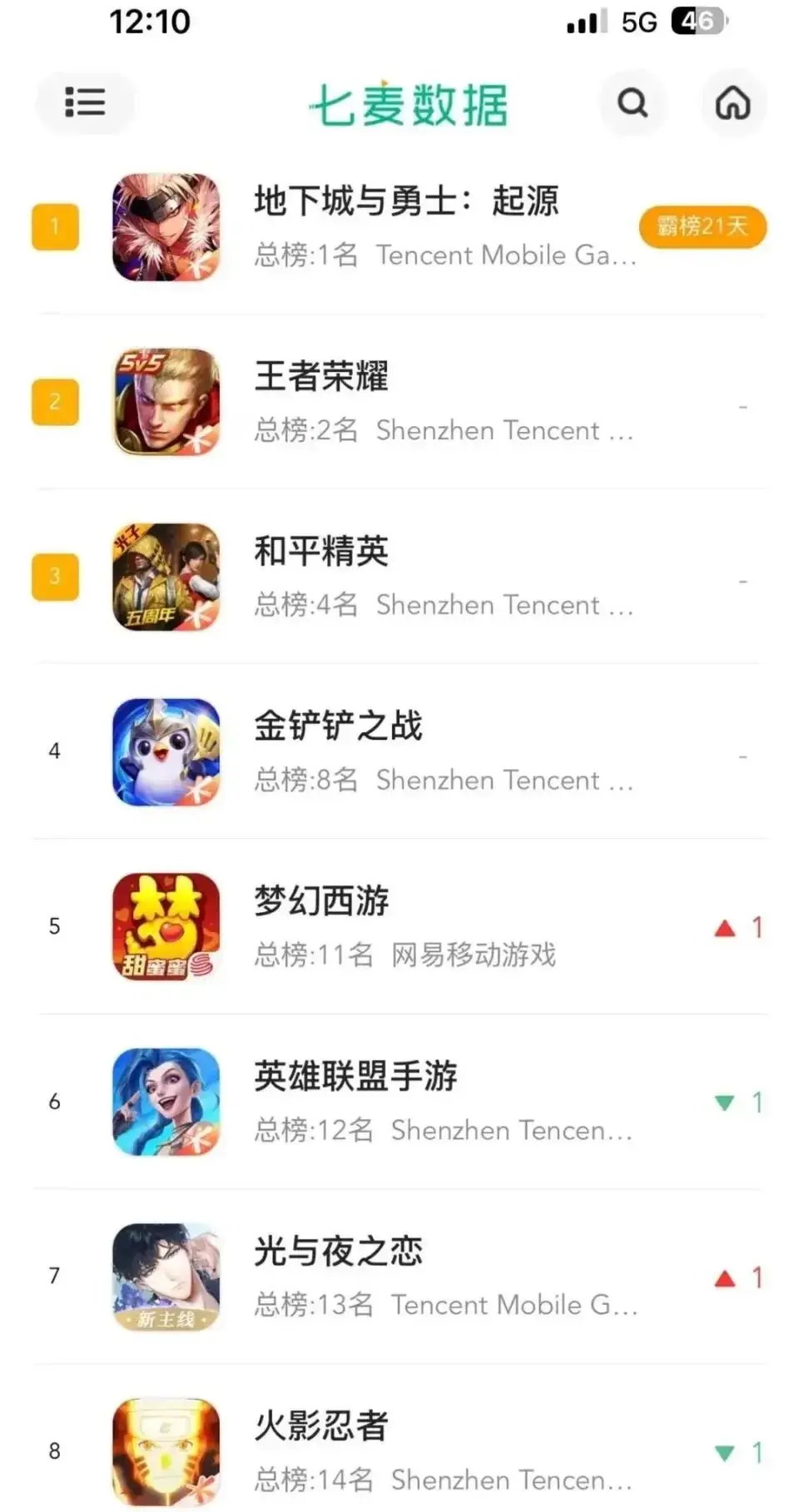 这一天腾讯旗下的游戏在iOS游戏畅销榜的前八名里,占据了其中的七个席位(第五名被网易旗下游戏获得),而且是旗下的天美、光子、北极光、魔方和发行线几个工作室全面开花。