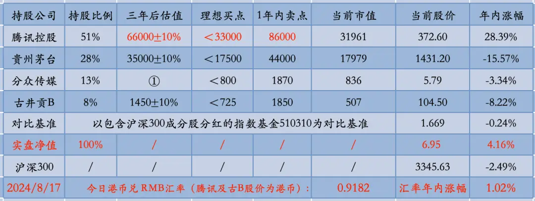 腾讯控股51%,贵州茅台28%,分众传媒13%,古井贡B8%。