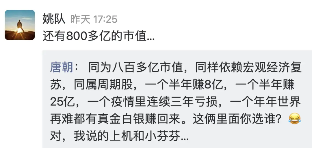 “同为八百多亿市值(此刻上机846亿,分众836亿),同样依赖宏观经济复苏,同属周期股,一个半年赚8亿,一个半年赚25亿,一个疫情里连续三年亏损,一个年年无论世界有多难都有真金白银赚回来。这俩里面你选谁?”