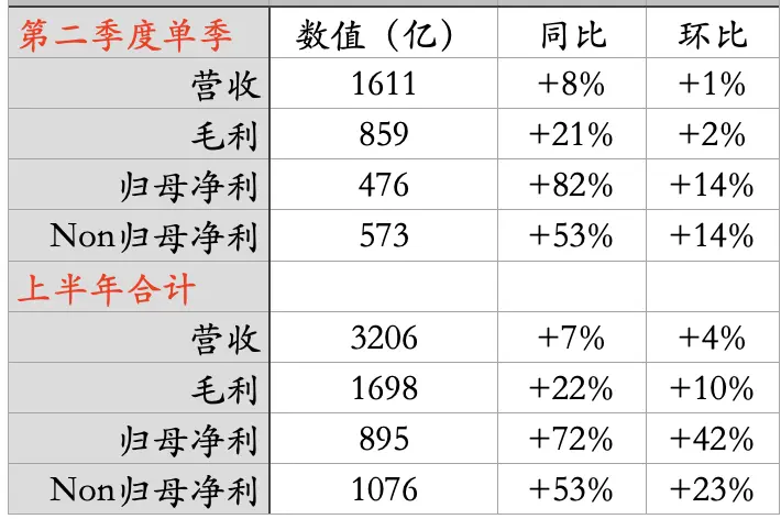而且这个幅度超越还非常大。以上半年合计数同比为例,营收同比增长7%,毛利同比增长22%,归母净利同比增长72%或53%(一般都是看Non口径)。