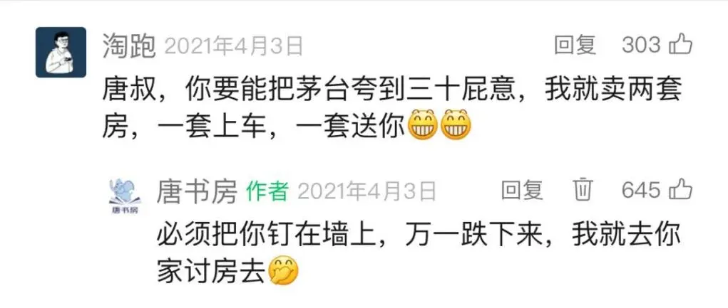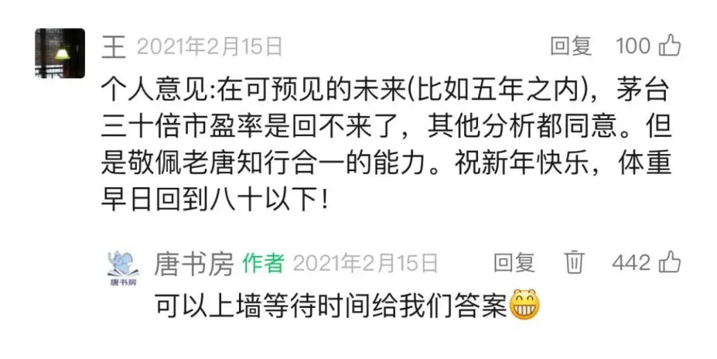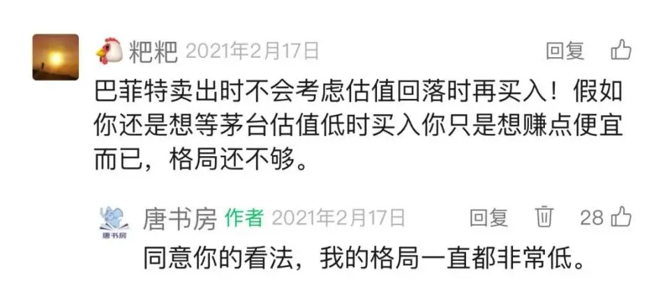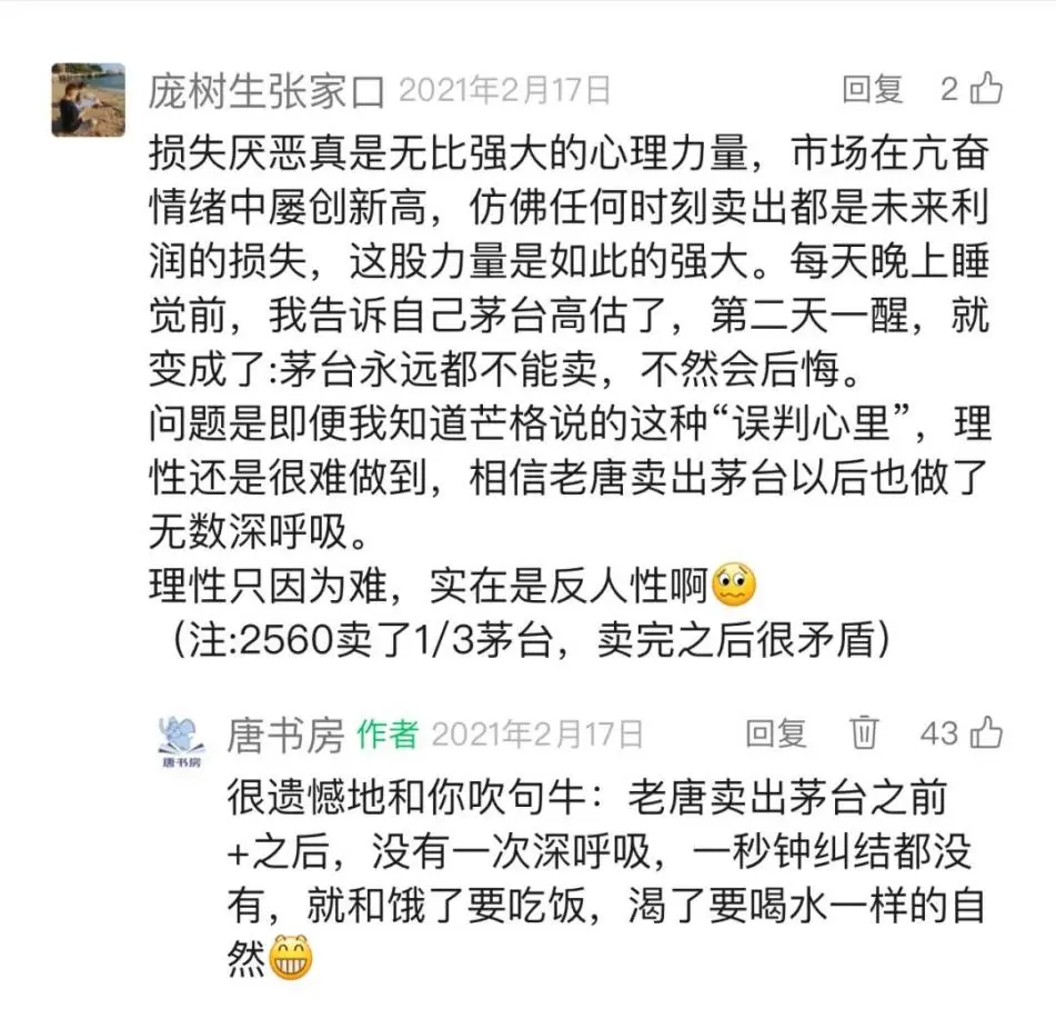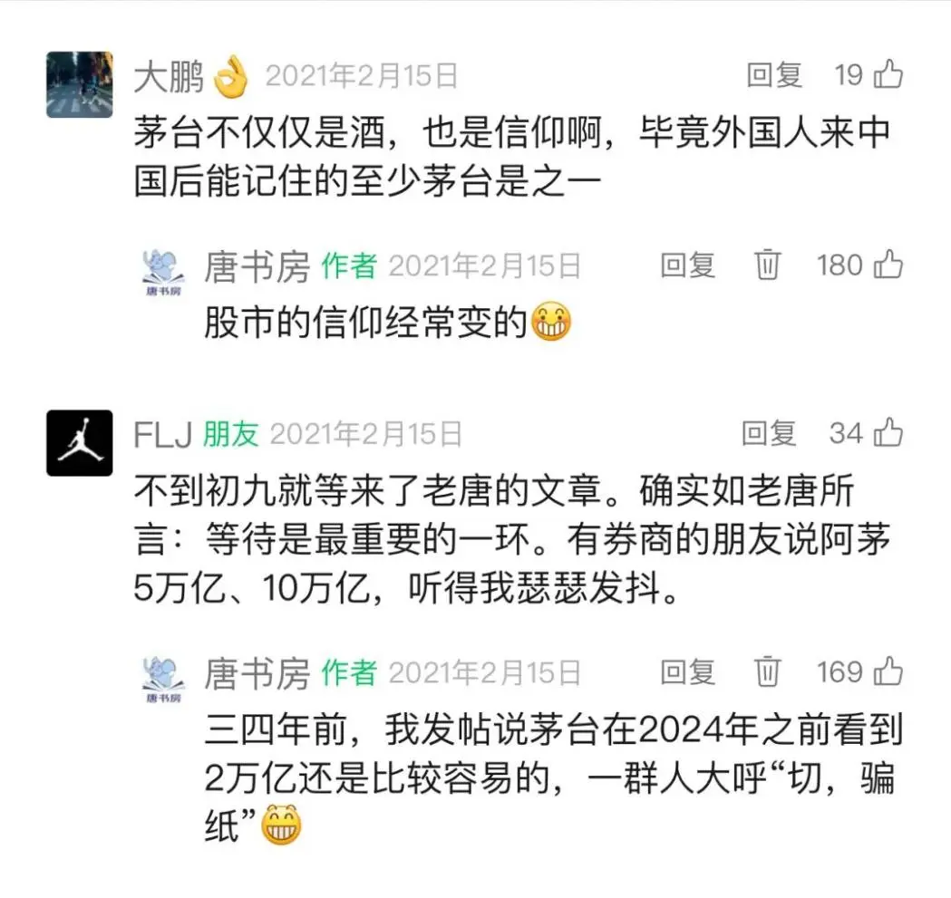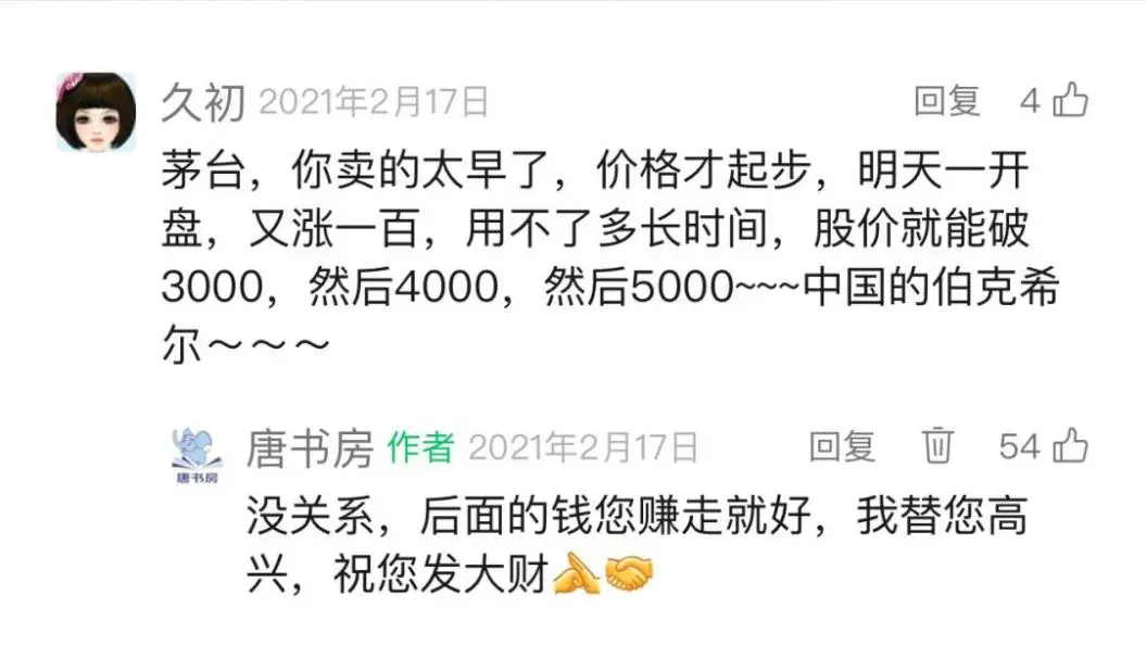 此时最合适的,是捞起2021年我清仓茅台前后部分留言,我们一起回味一下连续上涨之后的市场乐观气氛。
