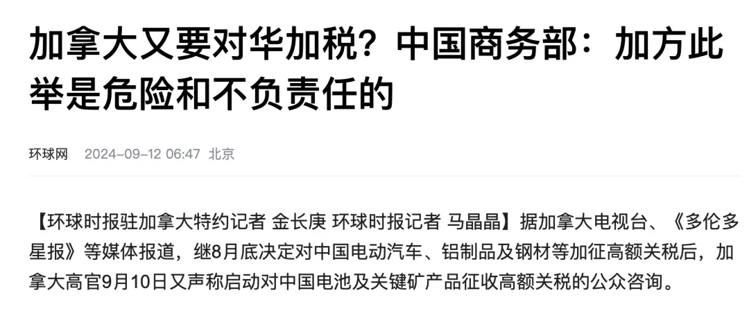 9月10日,加拿大再次启动对华加征关税,我方商务部宣布加方此举是危险和不负责任的;