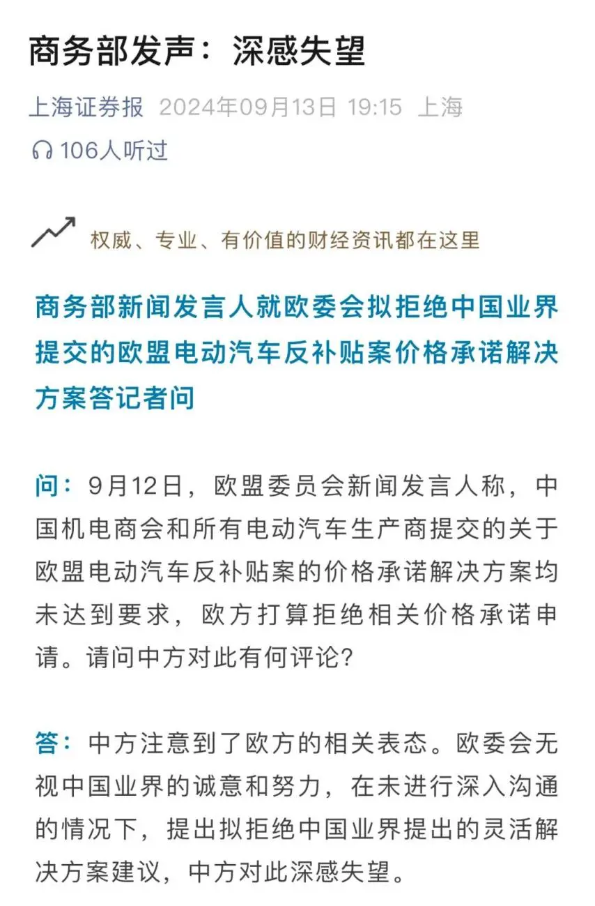 9月12日,欧盟委员会拒绝接受中方的价格和补贴承诺,一意孤行延续错误作法,坚持要对中国出口欧洲的电车加征关税。