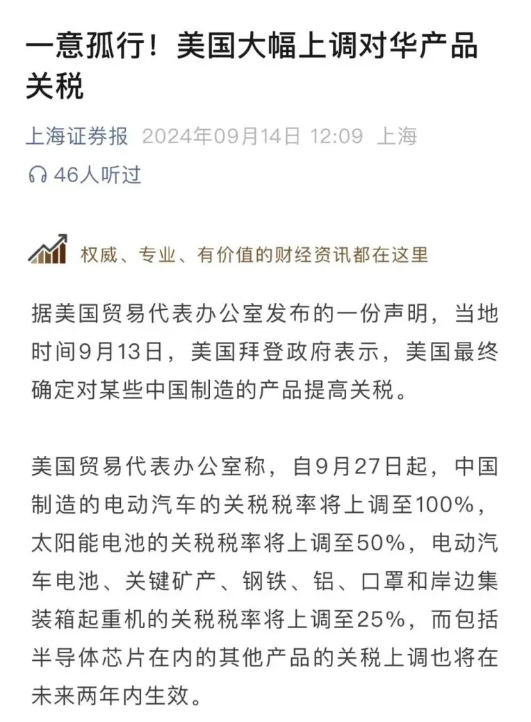 9月13日,美国拜登政府一意孤行,宣布大幅调高部分中国制造产品的关税。我方商务部已经敦促美方纠正错误,立即取消全部对华加征关税。