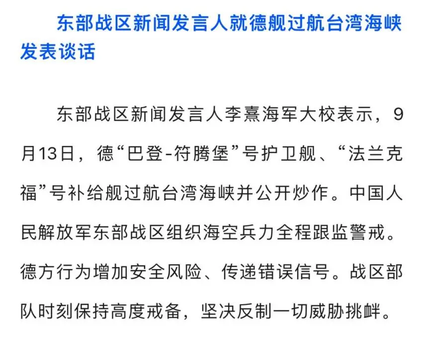 昨天,德国军舰不顾我方强烈抗议,二十二年来首次穿越台湾海峡。我方海空兵力全程跟监警戒,战区部队时刻保持高度戒备,坚决反制一切威胁挑衅。