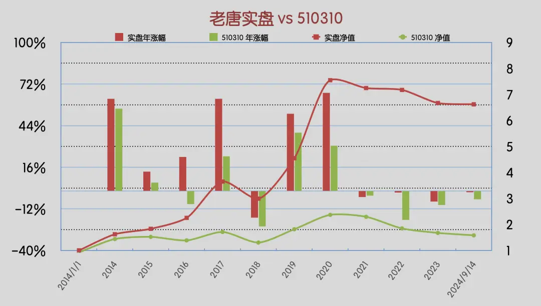 2024年内,沪深300指数基金510310涨幅-5.62%,老唐实盘净值涨幅-0.76%。