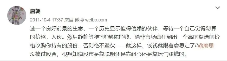 我的个人经验是,满仓套牢不动,最容易,几乎所有炒股的都会;空仓不动,稍难,需要一定的克制力;盈利30%~100%之间呆坐,最难,必须对公司价值有大致估算,能抵御波动的诱惑。如果盈利30%~100%之间,还要每天上雪球聊天吹水扯淡,眼见股票天天涨得烦,难上加难。一旦呆坐盈利超过100%以后,又回归简单了。”——唐朝2016-08-10雪球