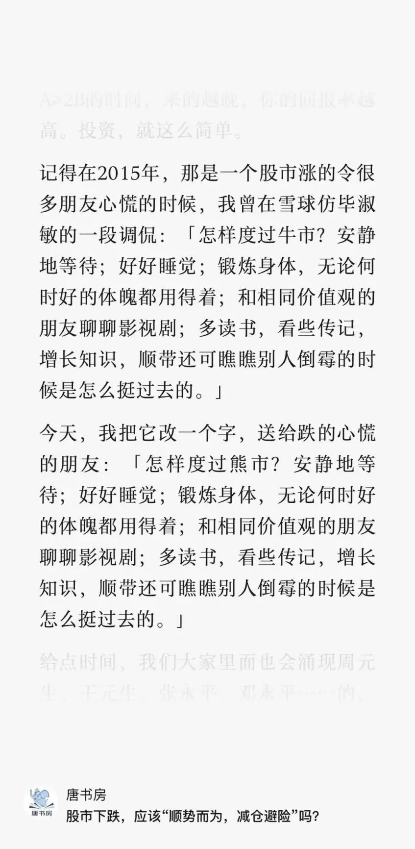 在市场三天就能收复三年跌幅的巨大波幅之下,如何面对牛市,又成了许多朋友的“软肋”。许多朋友此刻都会捞起来老唐八年前写过的这段话: