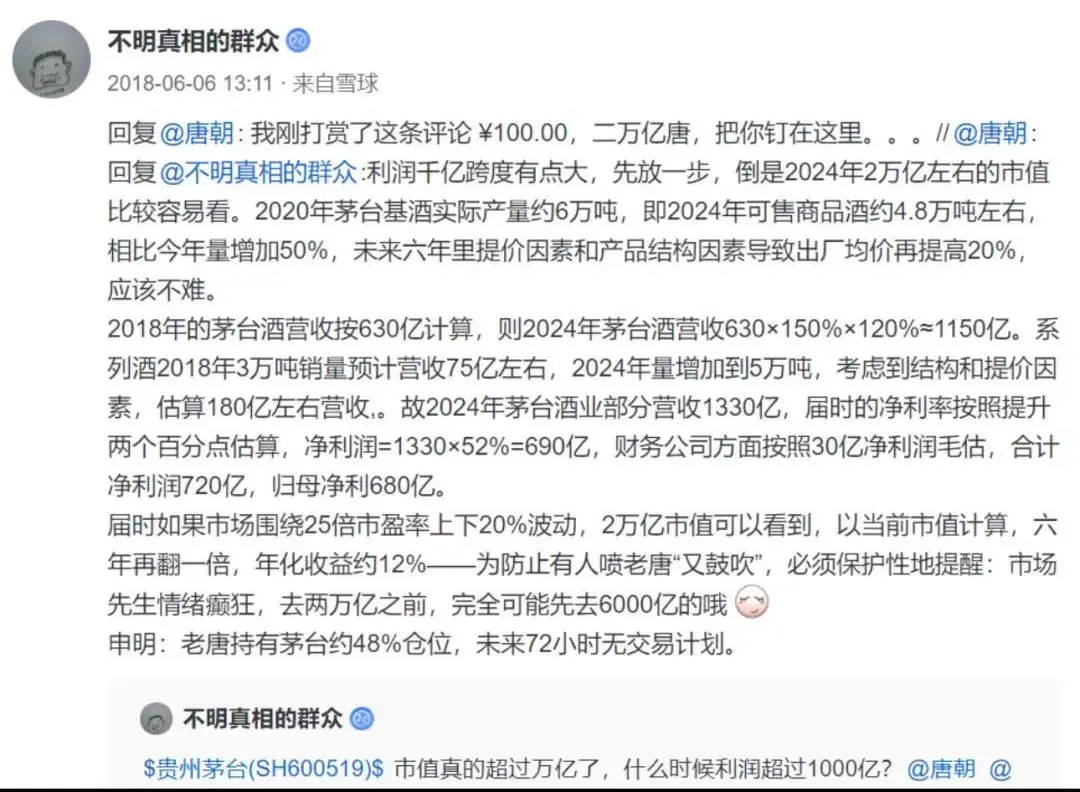 以茅台为例,六年多前我曾经给过一个估算,认为2024年茅台归母净利大约680亿,合理估值大致应该在两万亿左右。