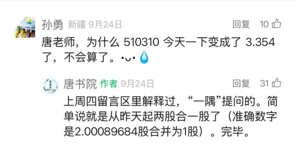 9月23日,510310搞了个合股,导致单股数字发生了一点小变化,是个无关紧要的变化。在留言区解释过几次,但依然有许多朋友问,我放正文里解释一次吧。