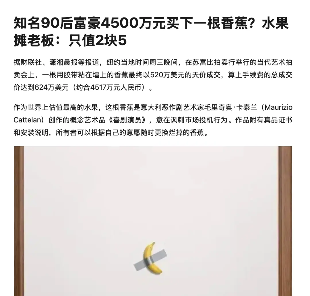 有意思吧?意在讽刺投机行为的一根香蕉,用胶带粘在画板上,卖了520万美元,加上手续费,合计4517万人民币。
