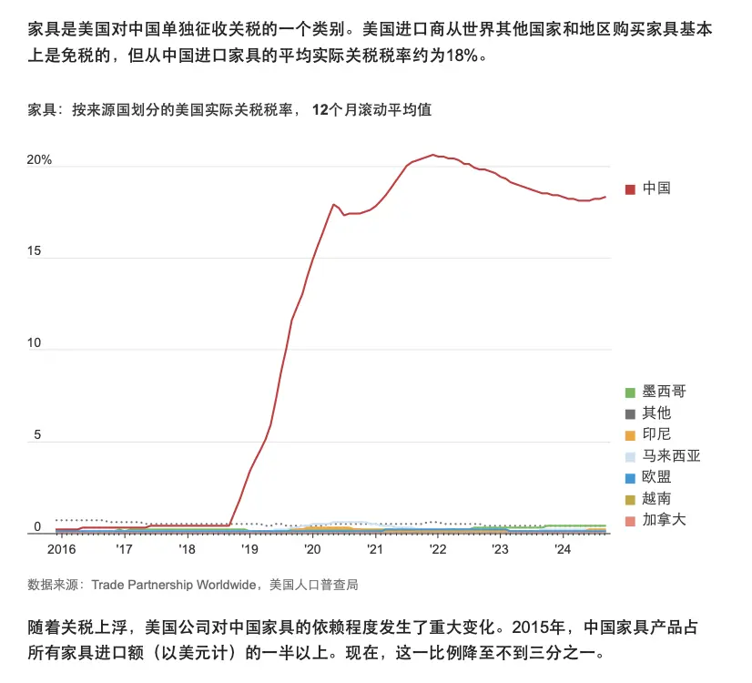 以冲击比较明显的家具产业为例,自2018年特朗普加税起,我国出口美国的家具产品,平均关税税率从零飙升至18%,市场份额从一半以上降低至不到三分之一。