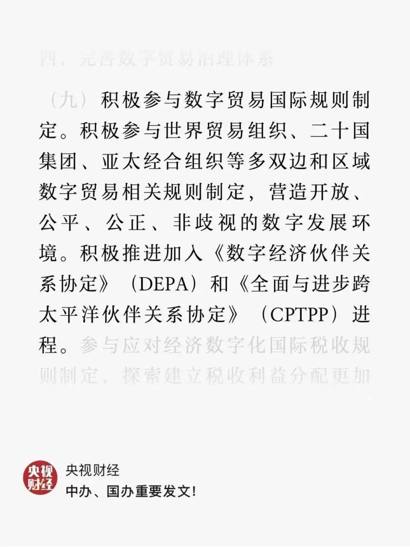 当晚,我们就推出了《关于数字贸易改革创新发展的意见》,提出了促进和规范数据的跨境流通,推动电信、互联网、文化等领域有序扩大开放,积极推进加入CPTPP等内容。